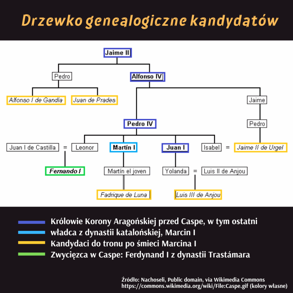 Jest początek XV w. Na tronie rozległej Korony Aragońskiej zasiada król Marcin I Ludzki, który swój przydomek zawdzięcza umiłowaniu do sztuki i historii oraz łagodnemu charakterowi. Wraz z ukochaną i charyzmatyczną żoną Maríą de Luną doczekał się czworga dzieci, ale przeżył jedynie najstarszy syn, zwany Marcinem Młodym. Pech chciał, że ów jedyny następca tronu umiera po nagłej chorobie podczas kampanii na Sardynii w 1409 r. (ponoć zaraził się malarią od pewnej Sardynki 😜 ), nie zostawiając dziedzica z prawego łoża. Król Marcin I próbuje zaradzić sytuacji, żeniąc się na nowo, jednak nie udaje mu się doczekać kolejnego potomka. Wkrótce 31 maja 1410 on również umiera, nie wskazując jednoznacznie nowego następcy.